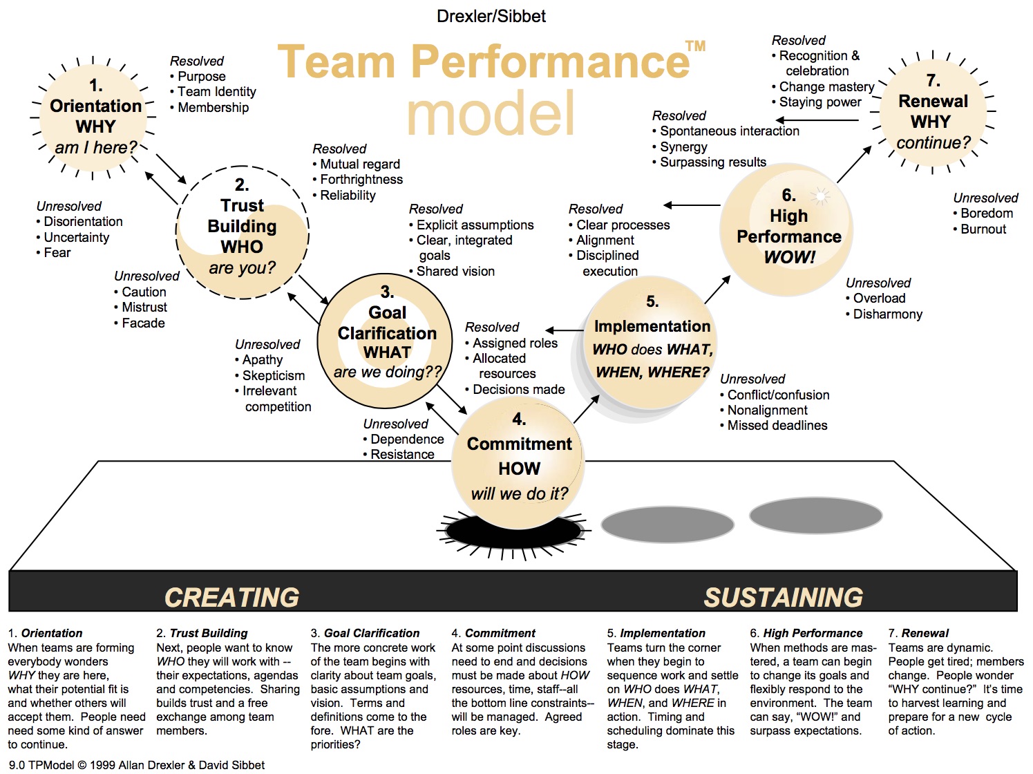 What teams need is a model and a map to get them started. We make use of the Drexler Sibbet Team Performance Model to illustrate the stages a team goes through on the way to high performance. The model helps by focusing areas for team members to discuss what they see and what they want.