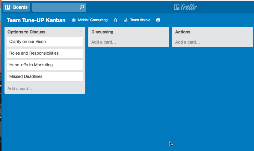 Here is an example of a team Kanban Board using Trello. You can also use a flip chart and sticky notes. Have Fun with this.